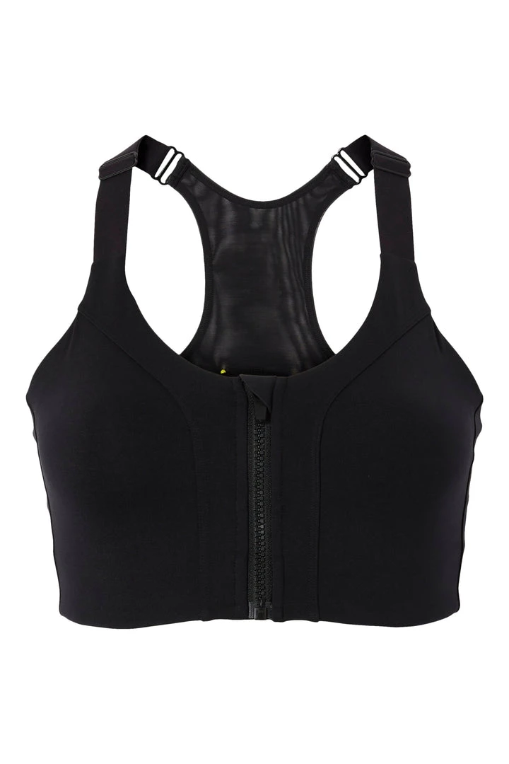 - The Allegro Zip Front Bra is a high-impact performance bra with a scoop neckline and racerback. Features molded cups and adjustable straps.