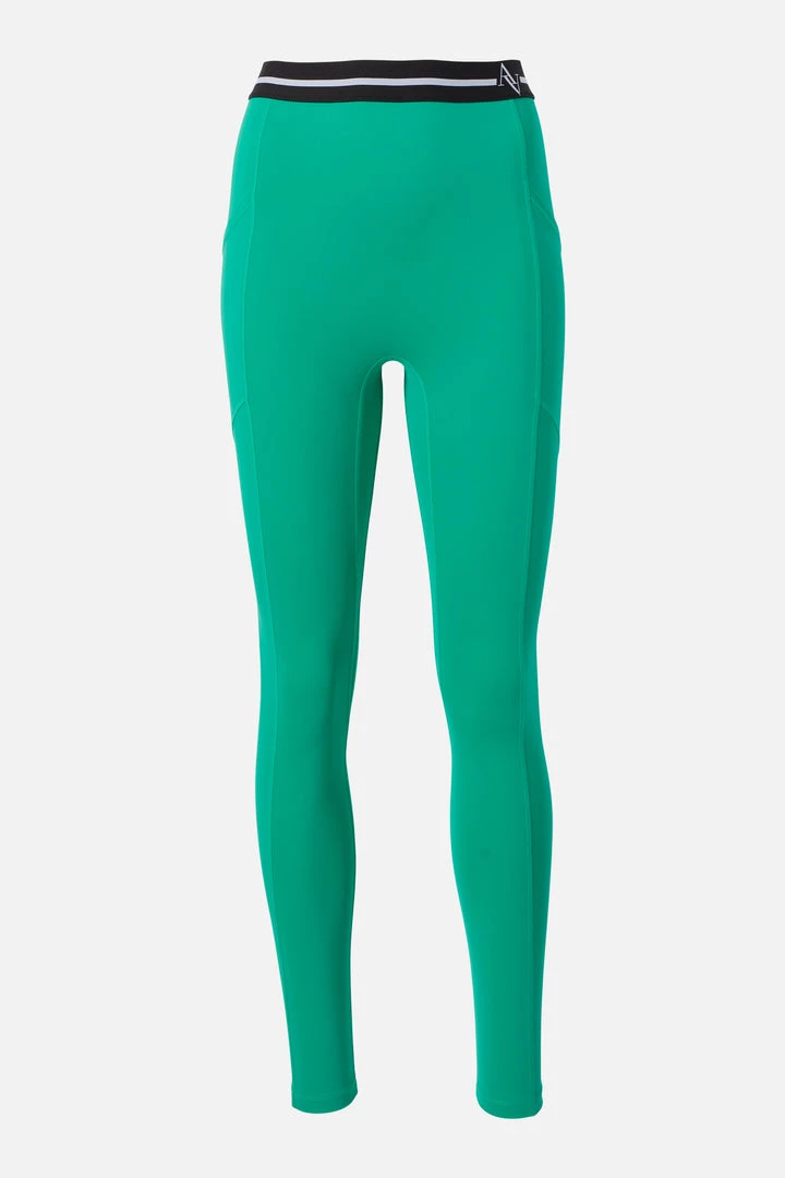 - The Logo Elastic Center Stage Pocket Legging is a high waisted performance legging made from signature All Motion high compression and sheer-proof fabric. Features a contrast elastic band with logo and two side slit pockets.