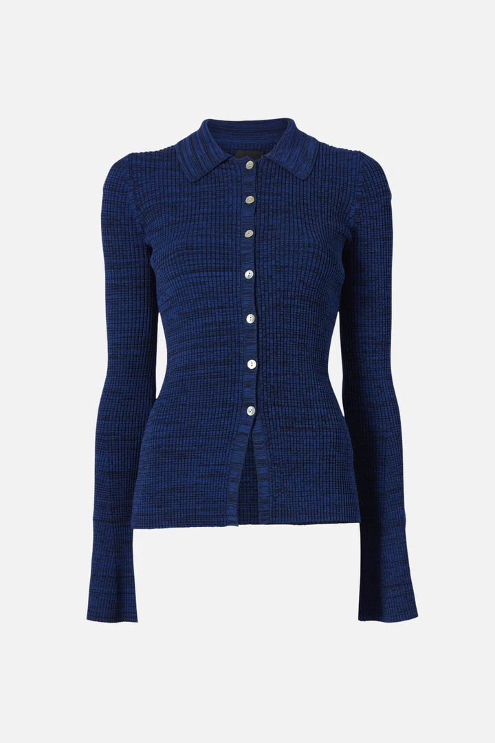 - The Rimini Collared Cardigan has a sleek rib texture with some drape, long sleeves, and buttons down the front and at the cuffs.