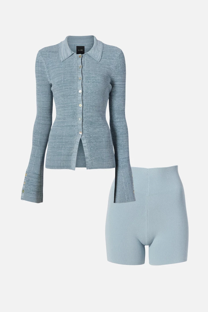 - The Rimini Collared Cardigan has a sleek rib texture with some drape, long sleeves, and buttons down the front and at the cuffs.