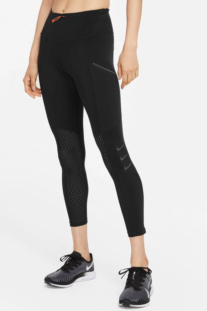 - Mid-rise waistband with an adjustable bungee cord