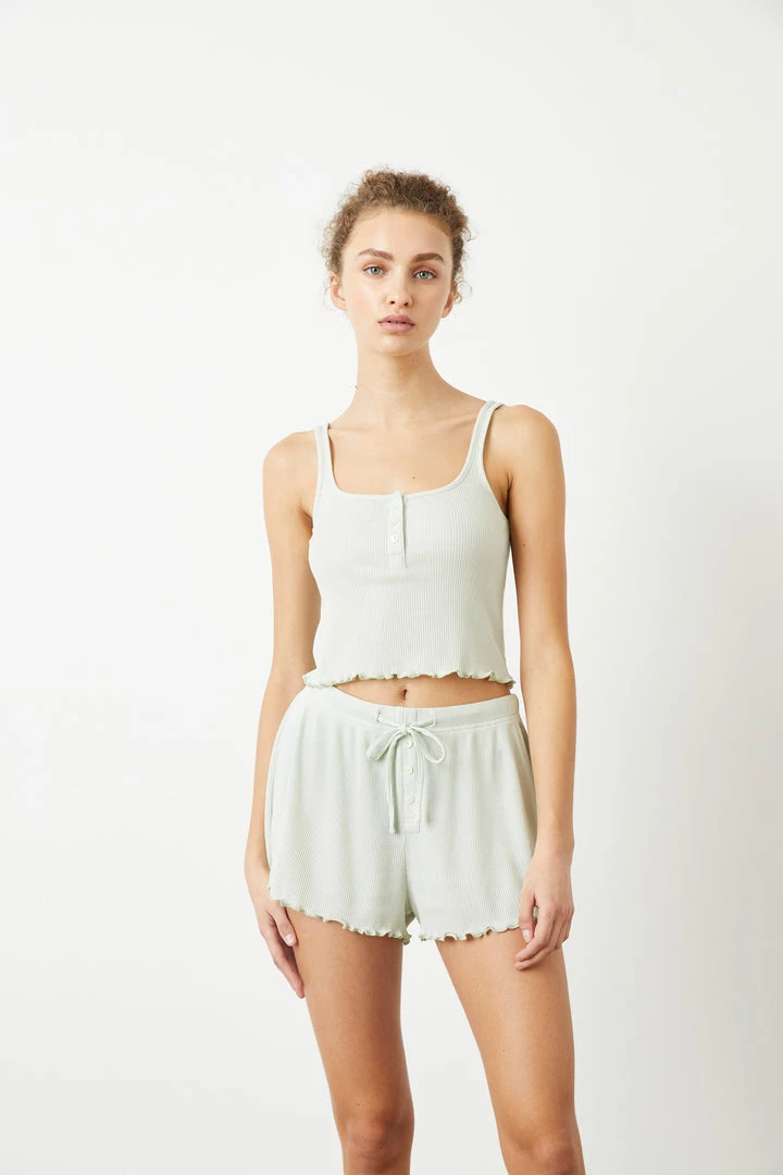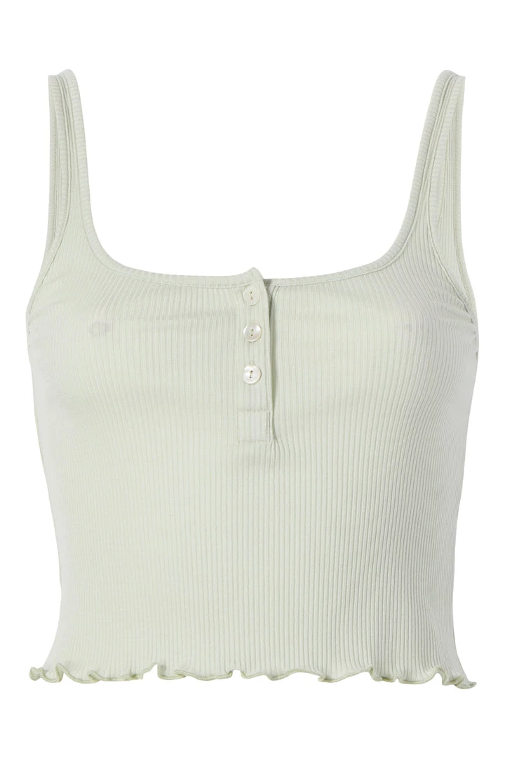 - The Hudson Henley Ribbed Tank is lightweight and soft featuring a scoop neckline with shell buttons and lettuce edge hem.